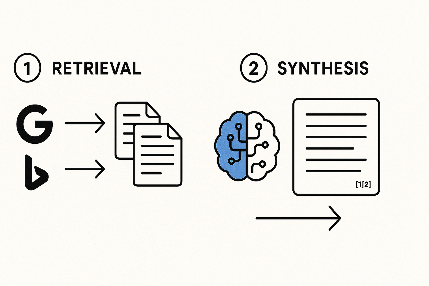 大多数现代生成式引擎采用 RAG(检索增强生成) 模型,包括两个阶段: