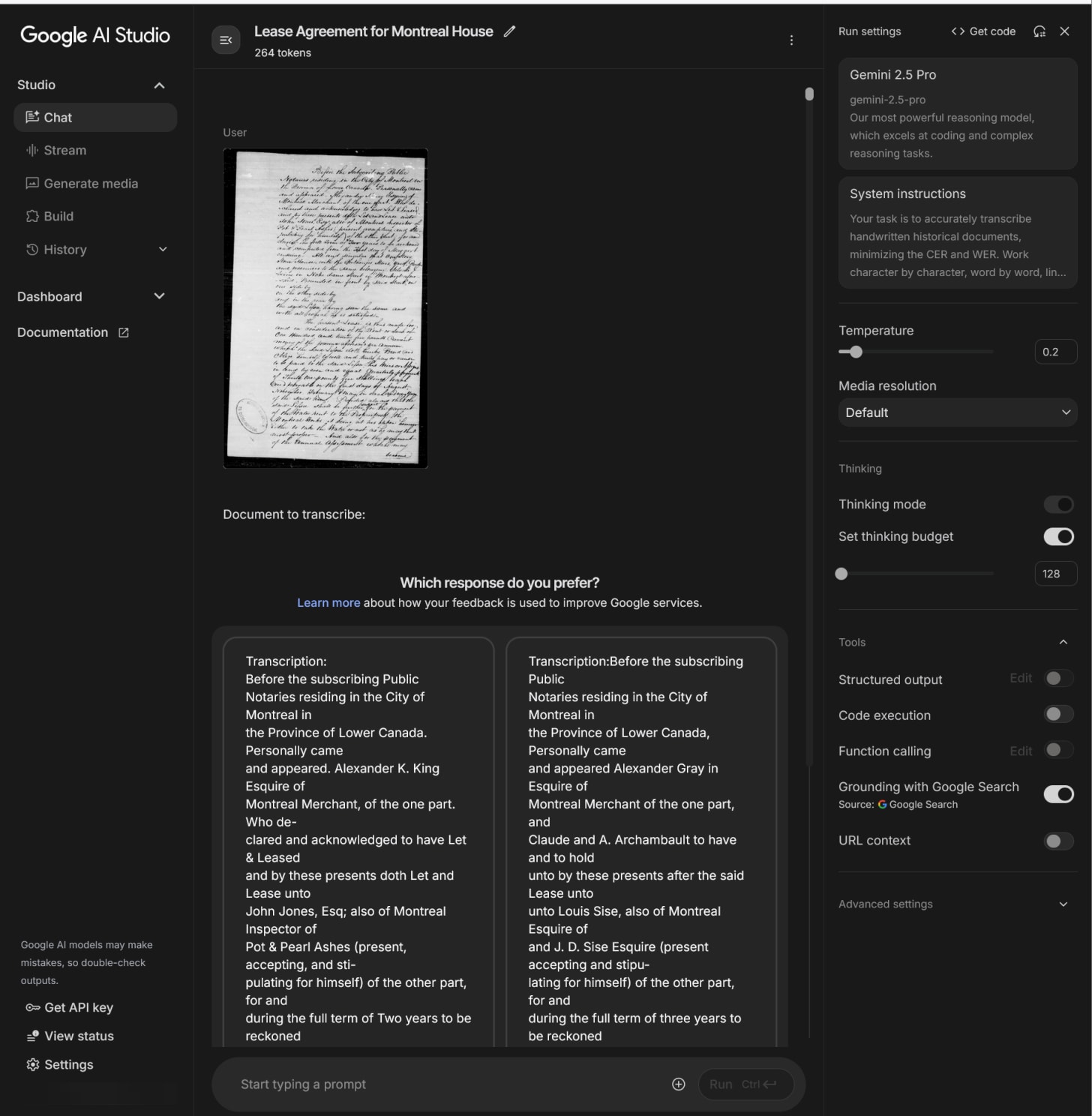 作为一名常年与18世纪手写档案打交道的工作者,我最近经历了一件让职业本能震颤的事。事情源于Google AI Studio的一个微妙变化——用户在反复尝试后,偶尔会看到两个不同答案并排显示,并被要求选出更好的那个。这种A/B测试模式往往预示着新模型即将发布,而这次泄露出的能力,可能标志着AI走出了量变到质变的临界点。