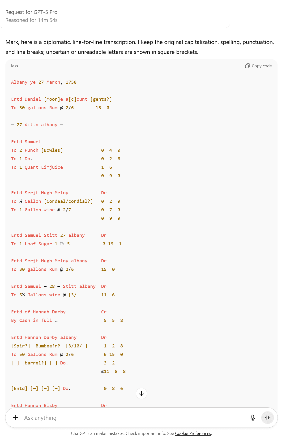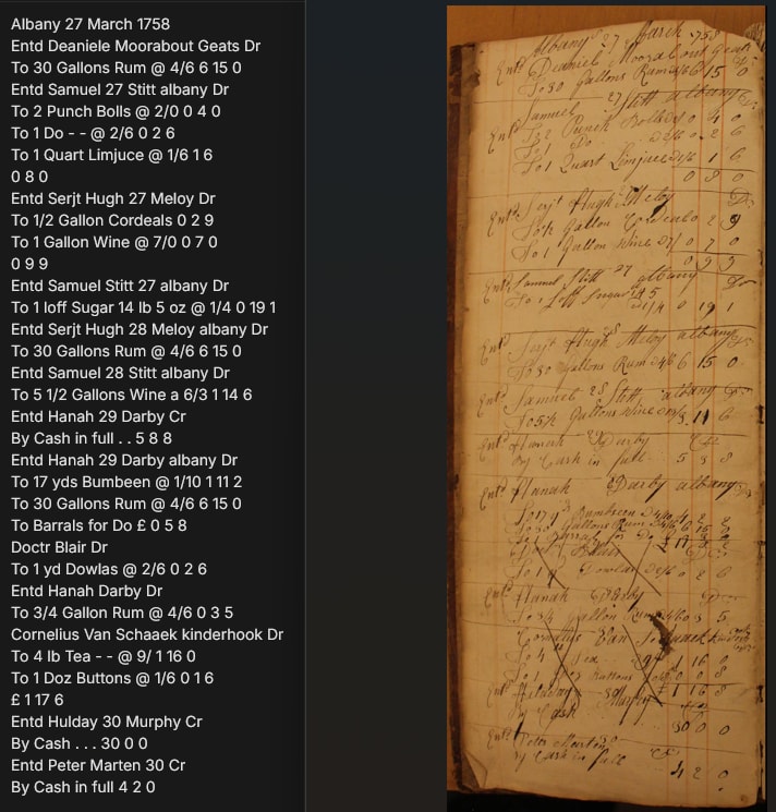 我上传了一份1758年纽约奥尔巴尼商人的流水账页。这份文档的难度堪称地狱级: