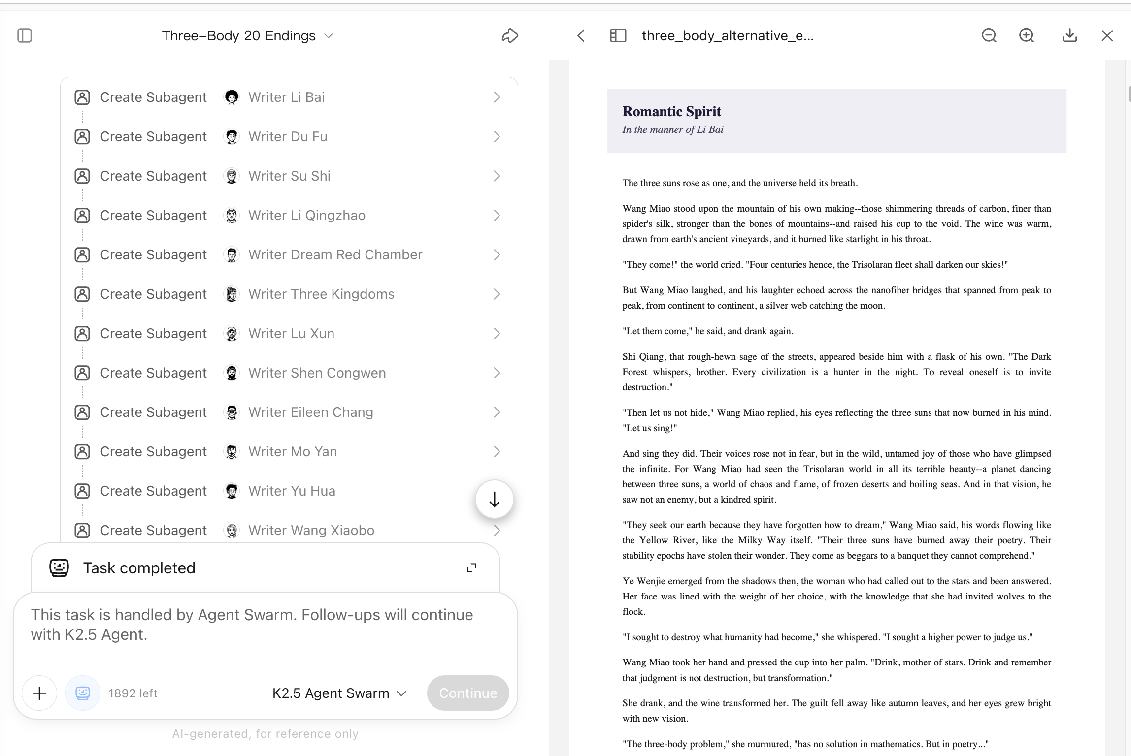A:通过多智能体分工,K2.5 Agent Swarm 会将任务分解,不同的子智能体负责特定的章节和对应的文档引用,最后进行合成。在生成 100 页文献综述的案例中,它能生成包含完全格式化引用和参考文献的双栏文档。