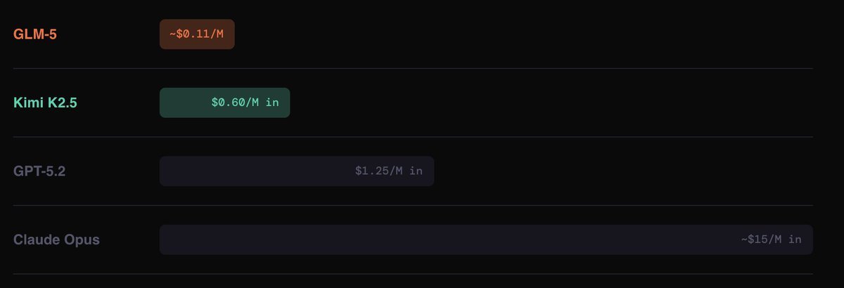 GLM-5 is roughly 5x cheaper than Kimi on input and over 100x cheaper than Claude Opus. However, there are two critical trade-offs: