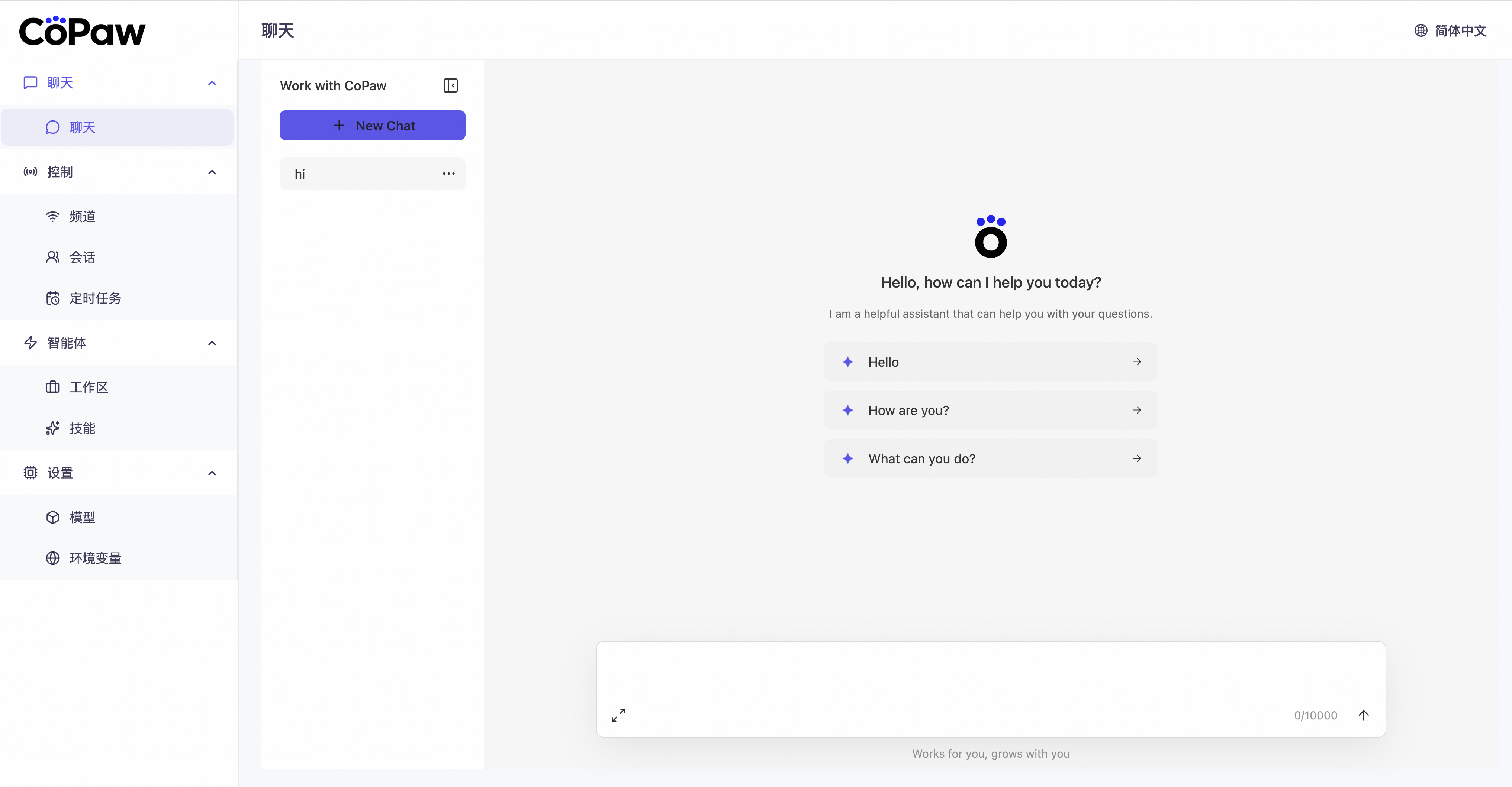 Type a message in the input box at the bottom and press Enter. Before you connect any external apps (channels), this is the most direct way to interact with CoPaw and confirm it’s working.