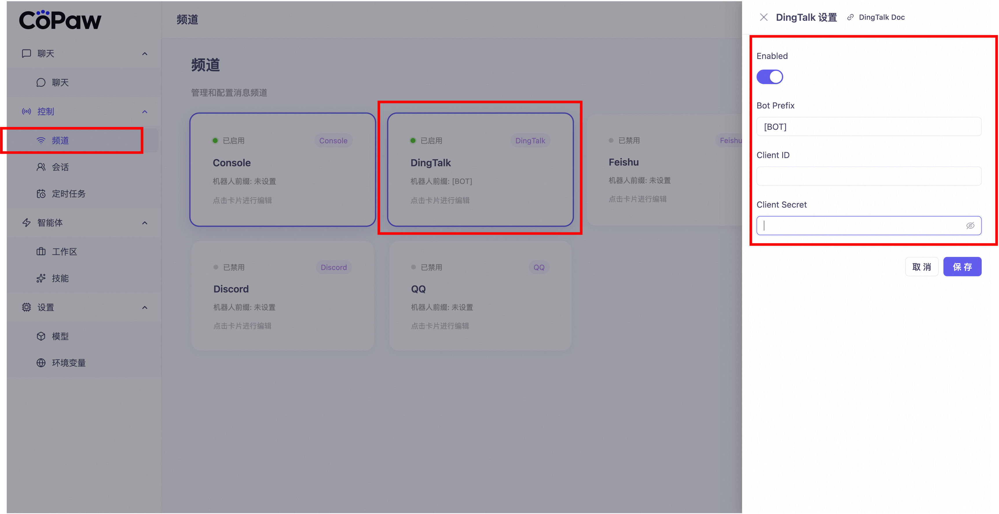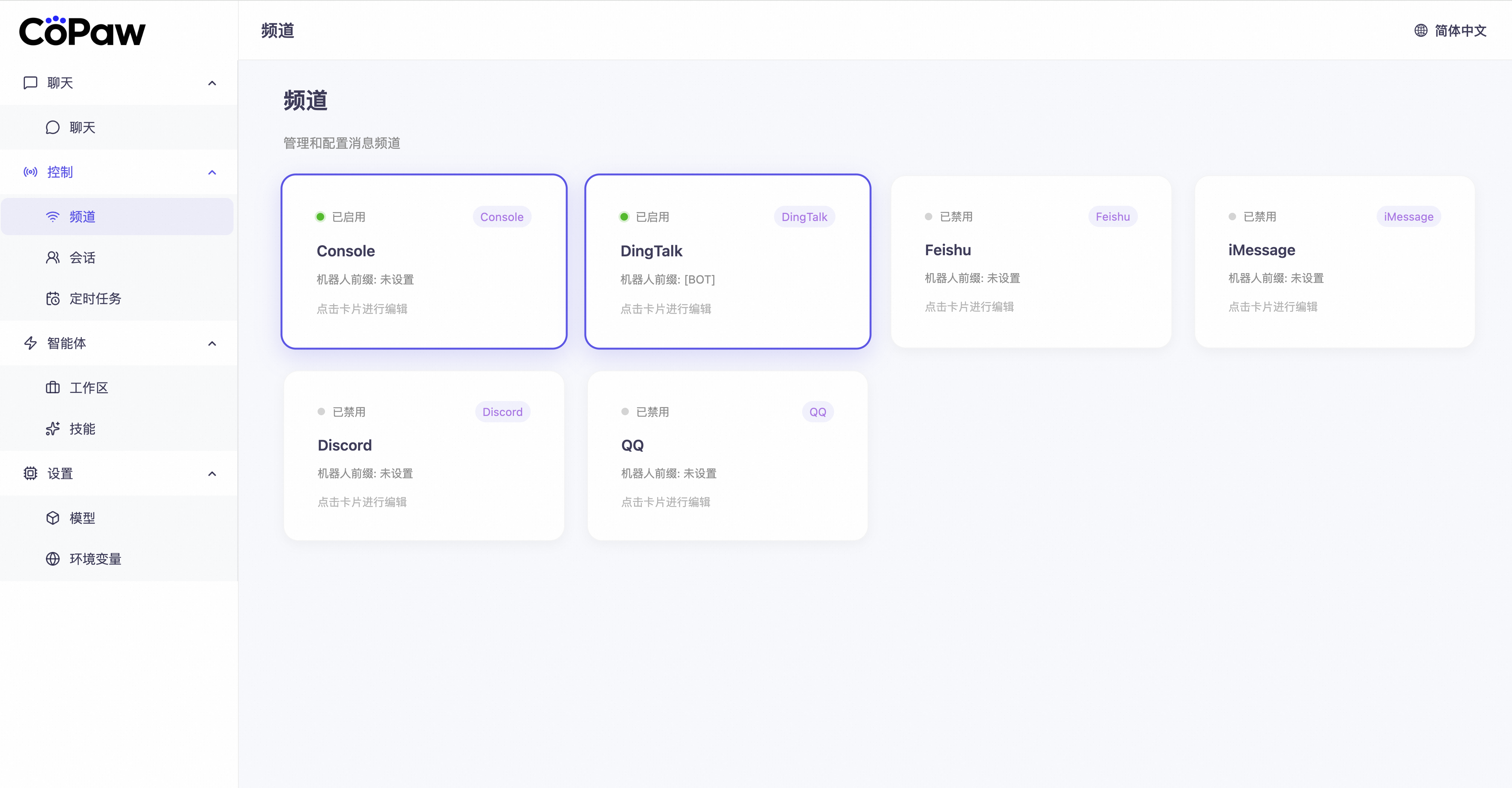 Back in the CoPaw Console, on the Channels page, click the “DingTalk” card. -