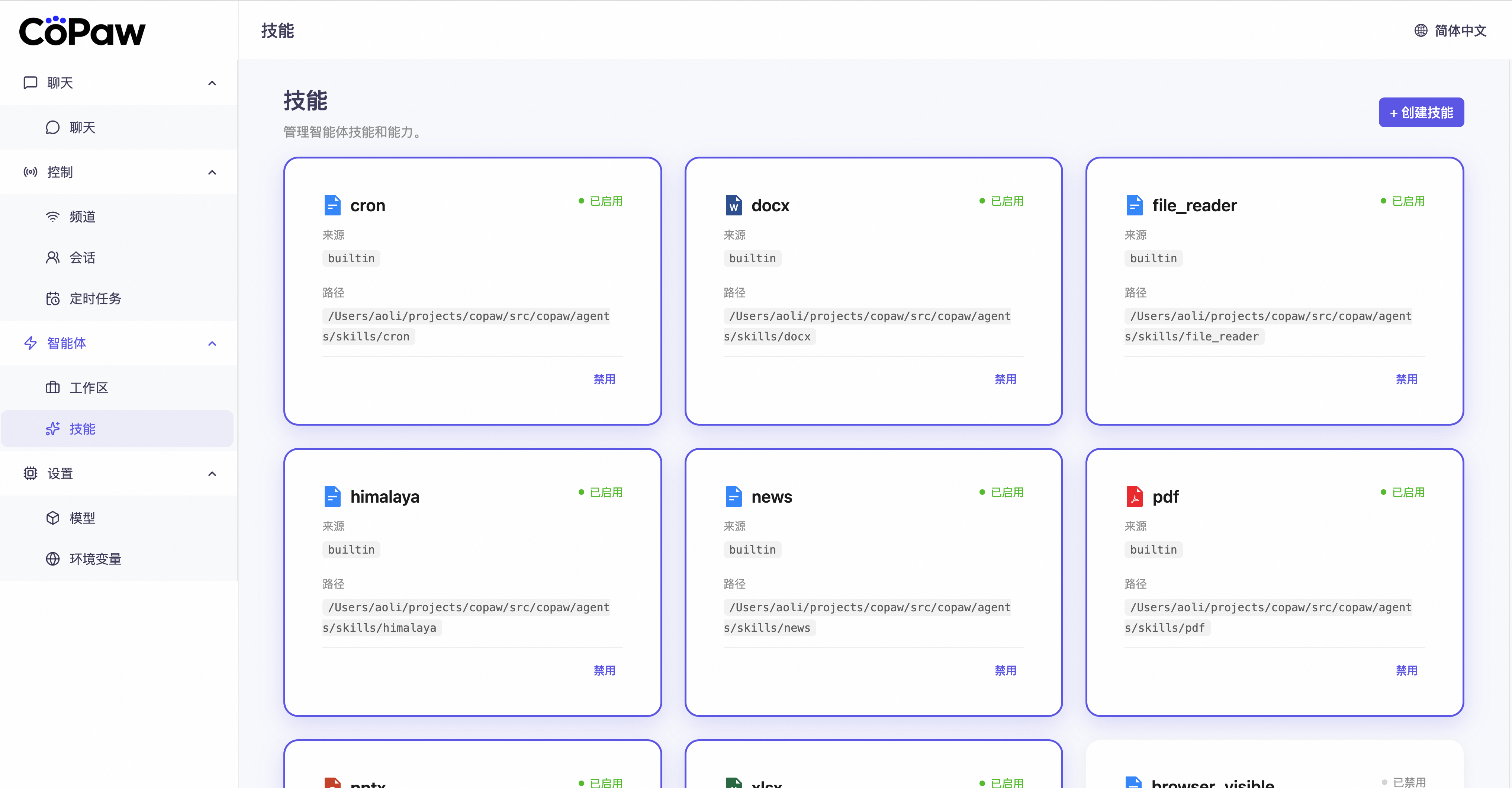 Its Abilities Are Defined by “Skills”: CoPaw is more than just a chat bot. What it can actually do is determined by which “Skills” you enable. Think of Skills as plugins. There are built-in skills for reading PDFs, creating Word documents, fetching the latest news, managing scheduled tasks, and much more. You can turn these on or off, and you can even create your own custom skills. -